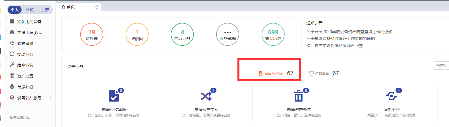 根据实设处和房产处《关于开展2020年度设备资产清查盘点工作的通知》http://leao.hust.edu.cn/info/1024/4151.htm,现启动2020年度设备和家具的资产清查盘点工作,请各系所高度重视固定资产年度清查盘点工作。清查盘点能使各位教职工对自己名下资产的数量和质量状况全面了解,优化配置,避免浪费,更能保证资产的账物相符。请各位教职工认真对待,发现问题及时处理。