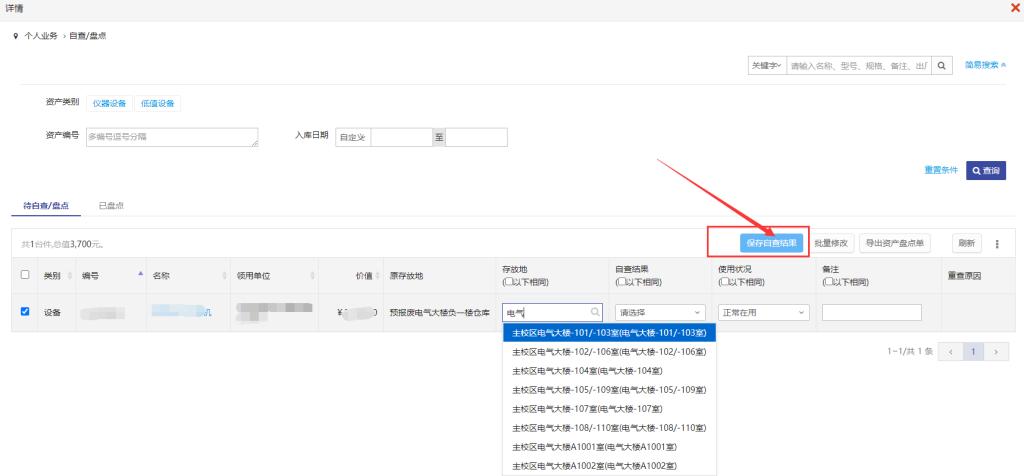 点击【待自查/盘点】,进入个人自查页面, 对自查的资产进行账务核对,填写标准化地址存放地,然后点击“保存自查结果”如下图所示:
